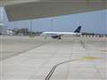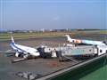 CDHC8-Q400とB737-400の右端にB737-400が小さく写っていますが、こんな感じの部分だけを1,200mmで引き付けて超でかく撮ってみようと思っています。それも炎天下の日に。陽炎によってグニャグニャに歪んだ写真が撮れれば狙いどおりになるのですが。