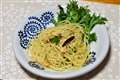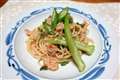 というわけでは試してみた。ニンニクの葉を潰し、味噌とお酢を混ぜたソースです。