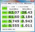 シーケンシャルリード・ランダムリード512KBは公称の60MB/sが出ていますが、ライトになるとぐっと落ちますね。