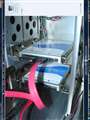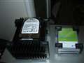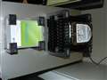 SSDのマウント。3.5インチのHDの上に置いてあります。さすがにそのままではなんですので。市販HDDマウントとプラ板で自作予定。