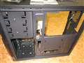 ケース2階部分が正面から見て左側に倒れる構造、5インチベイを止める為のパーツ、背面に2つの80mmファンを取り付けられるようにする為の白いフレーム。
