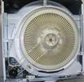 本体裏フタを開けて運転すると、モーターシャフト先端の黒色のプーリーが前後に動いて、風を送る大きなファンと連結しているベルトが振られ、裏フタに当たって異音が出ていた様です。