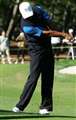 上体は決して回さず右を向いたまま左腰まで振ることです。左腰で下ろせると、自然に右肘が右腰にぶつかるはずです。