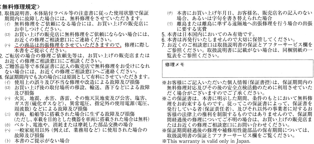 BW730保証書裏(クリックで拡大)