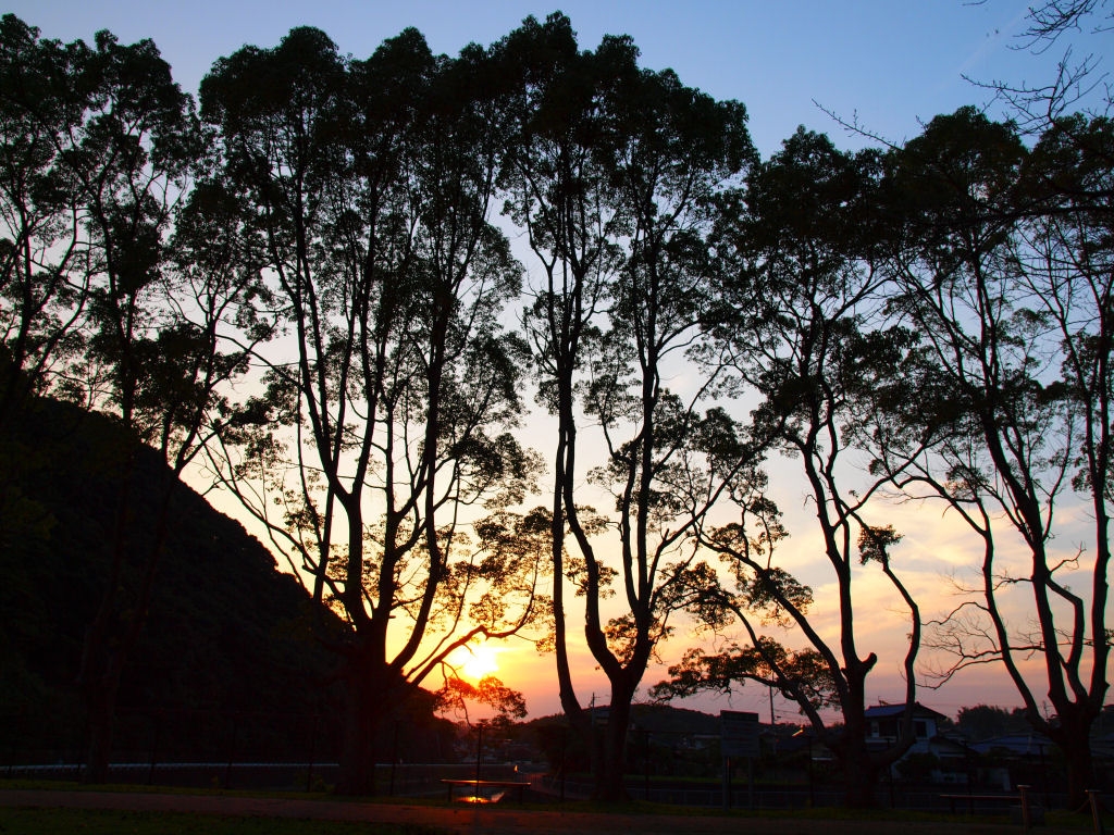 夕空を並木越し逆光で