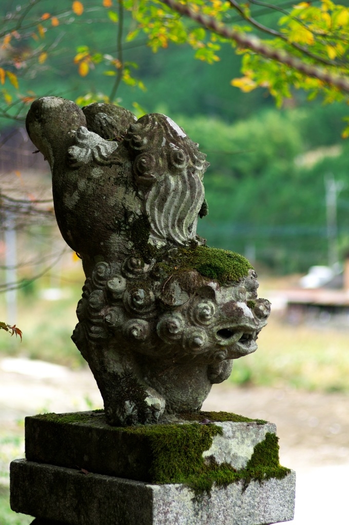 苔むした逆立ち狛犬