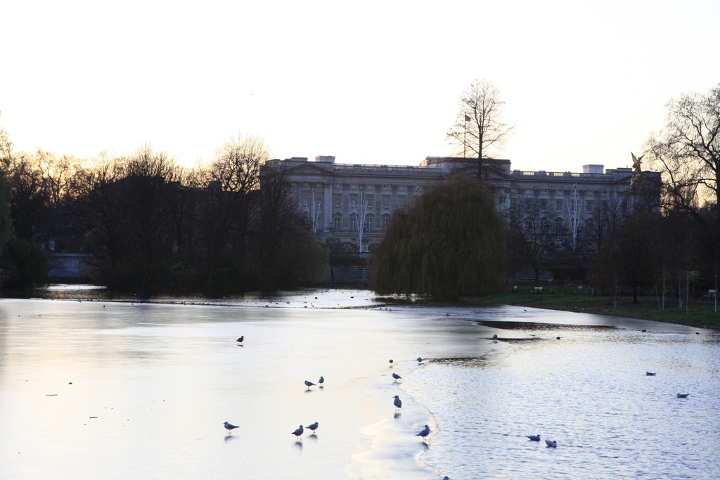 氷結したバッキンガム宮殿の池