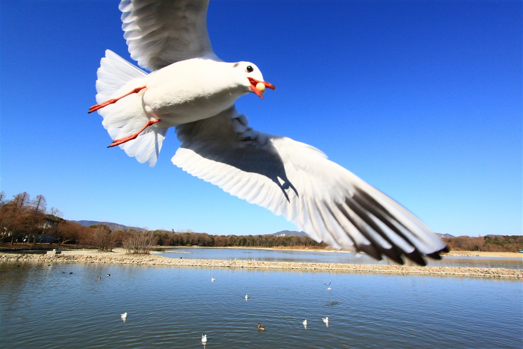 撮影現場の昆陽池(自分の羽にシルエットを映したユリカモメ)