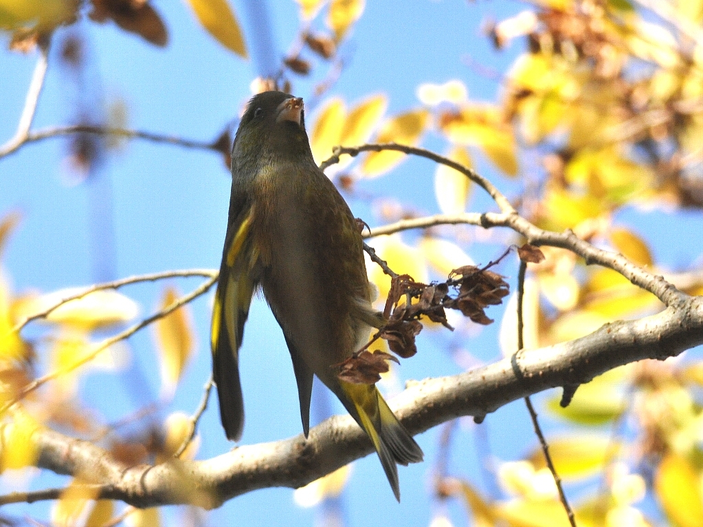 まだ馴れぬカワラヒワを仰ぎ見て