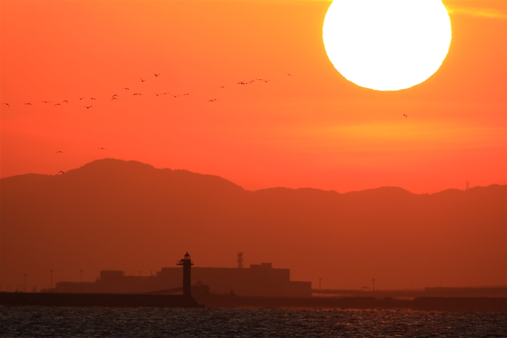 鳴尾浜から見た夕日(13km先は神戸空港、35km先は淡路の山並み)
