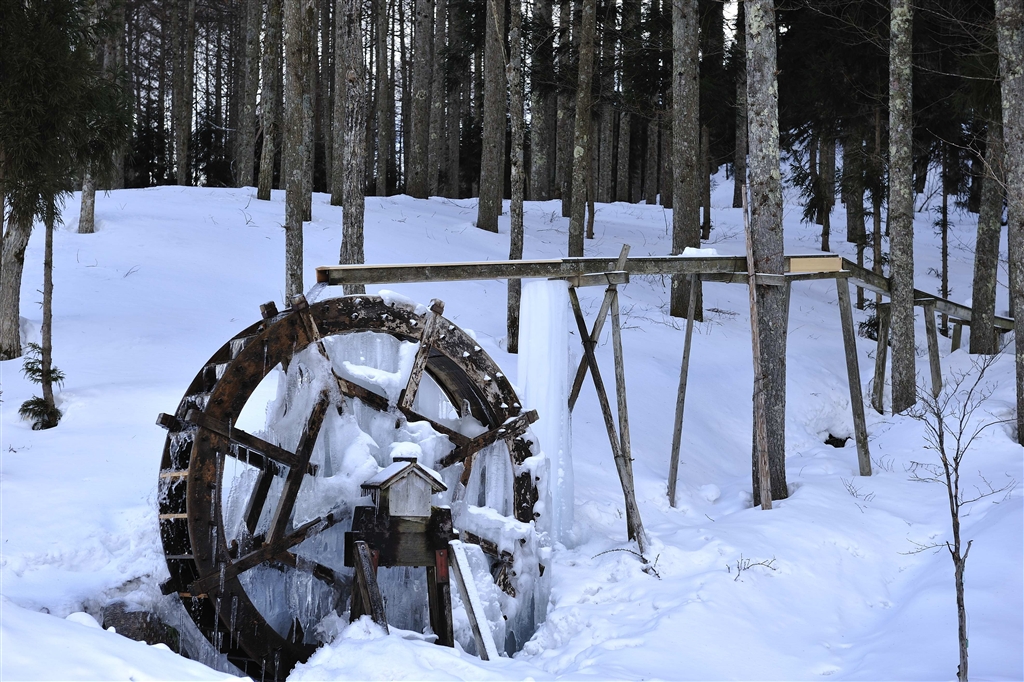 水車が凍てついています。