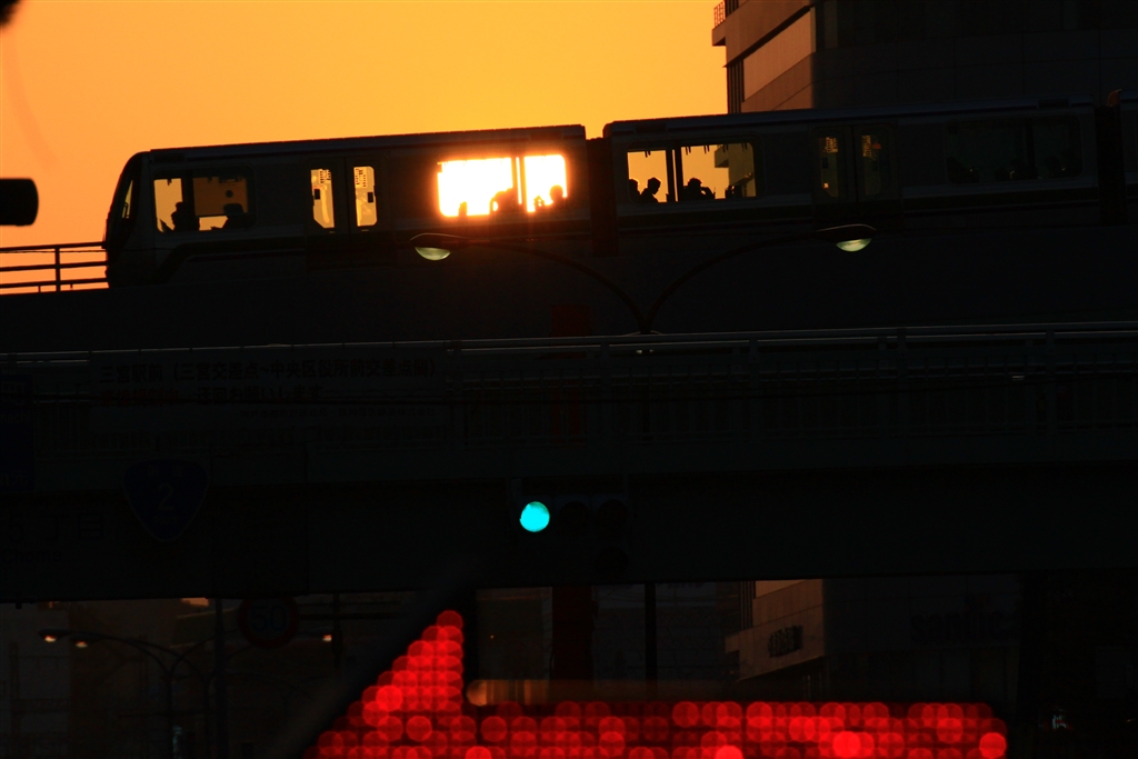 夕日の向こうをポートライナー(神戸空港行き)が走る