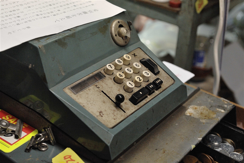 メカ式のレジ、現役で動いていました、30〜40年前のものでしょうか。