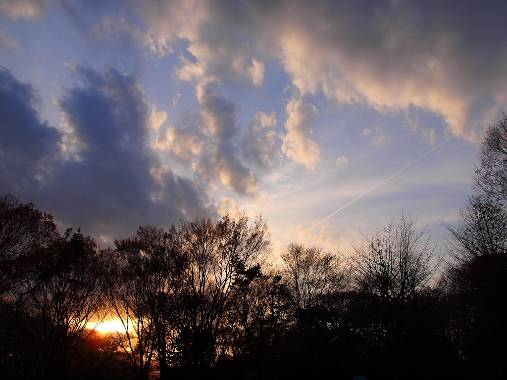 桜とは関係ないですけど、飛行機雲に目を取られて・・。