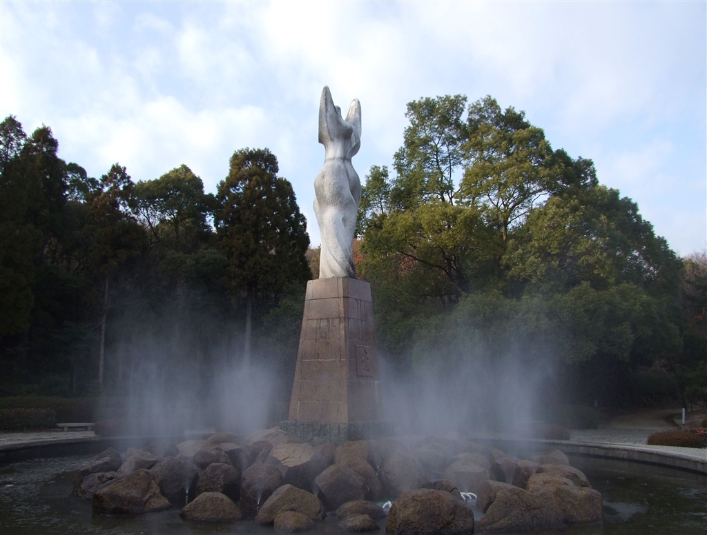 愛の像と霧噴水