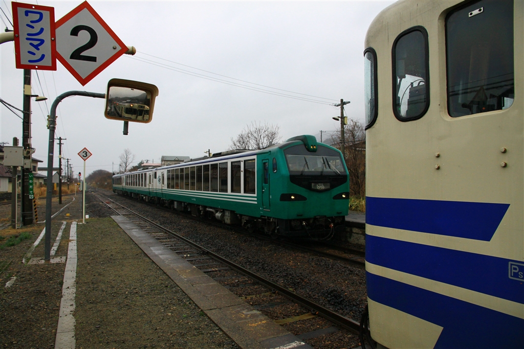 岩館駅:対向列車の待ち合わせ(こちらの列車の顔はミラーに写っています!!)