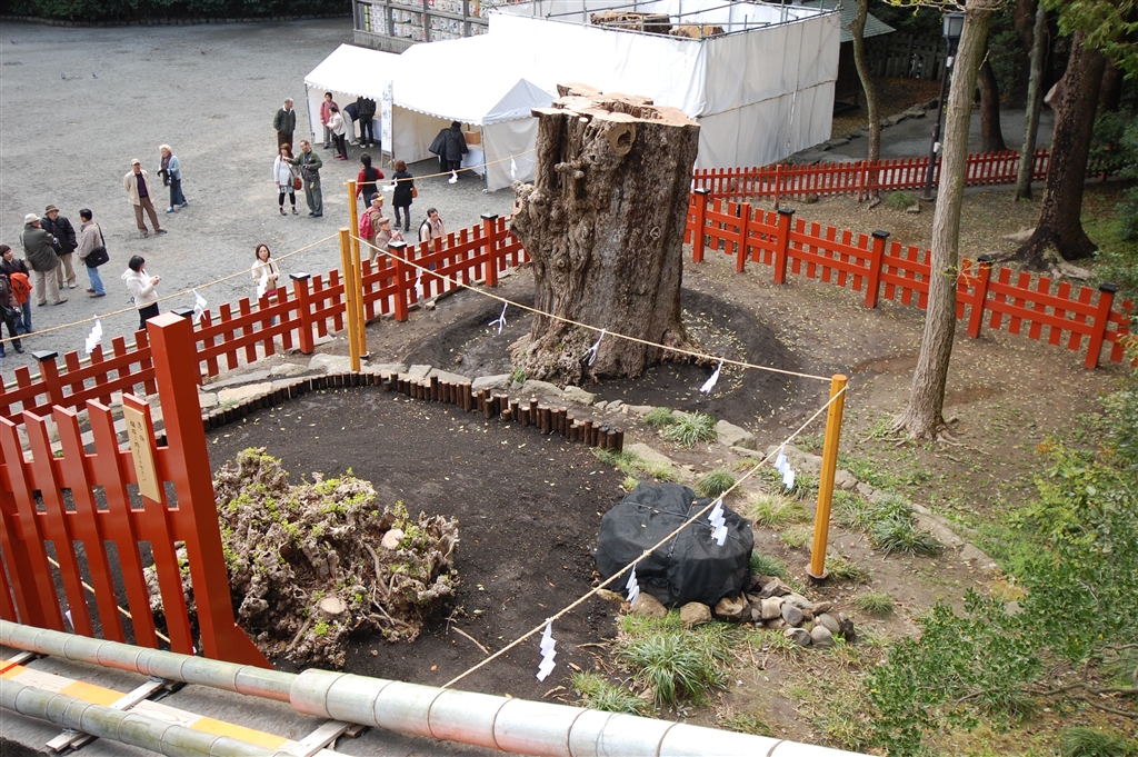 左が古い銀杏の根っこ。右は植え直した大木