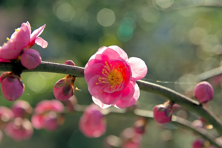 枝垂れ梅の紅梅を逆光で・・