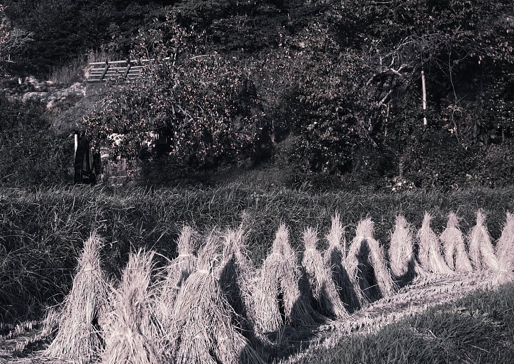稲刈りのすんだ田んぼと小さな水車小屋(シグマ18-125)