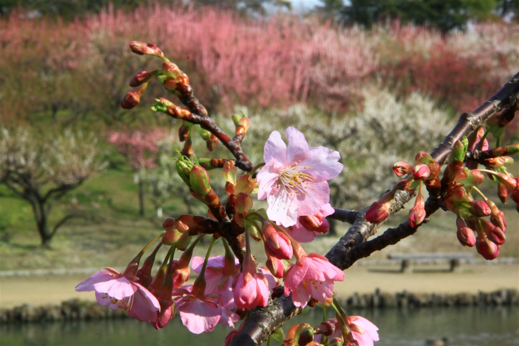 “おませ”な早熟桜をバックのウメと一緒に撮影(思いっきり絞り込んであります)