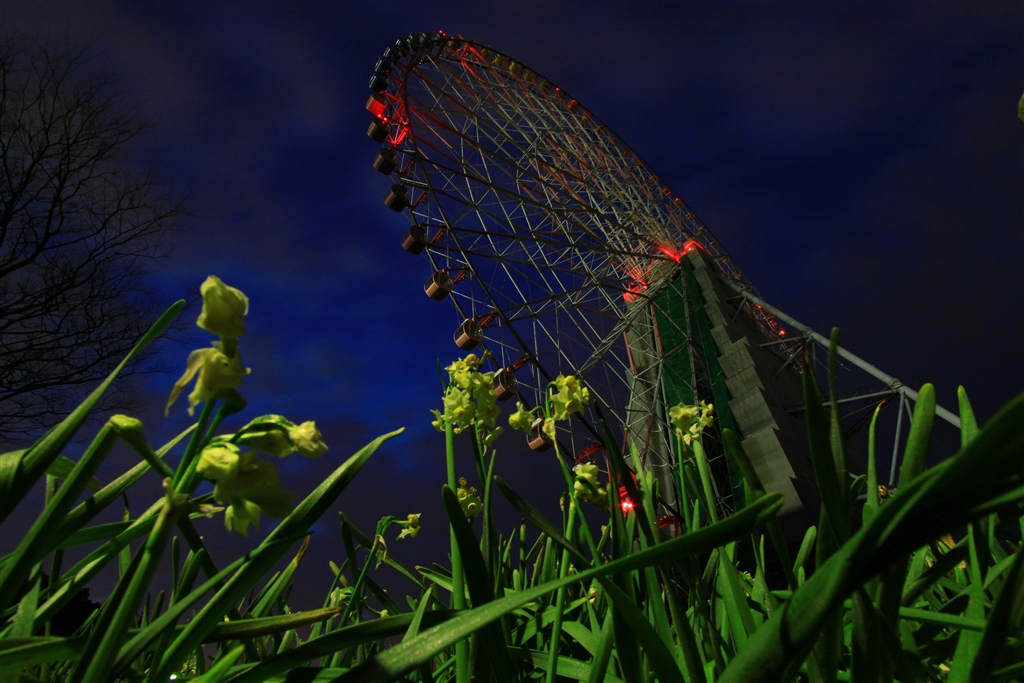 夜明け前のスイセン畑(バックは観覧車)