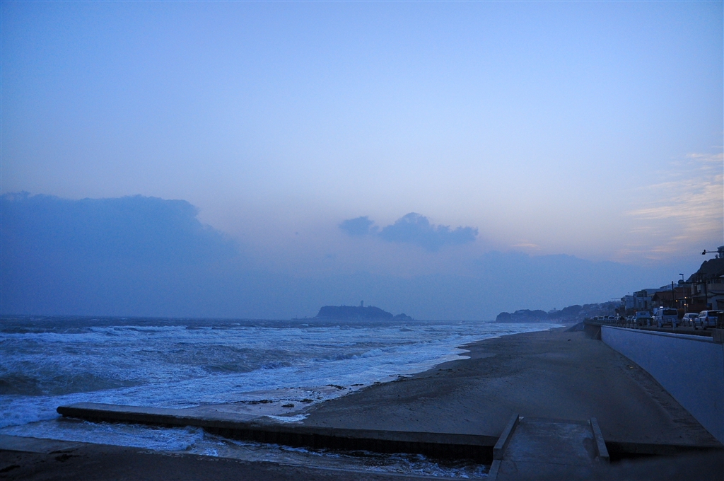 巻き上げられた砂が顔面直撃しまくりの七里ヶ浜