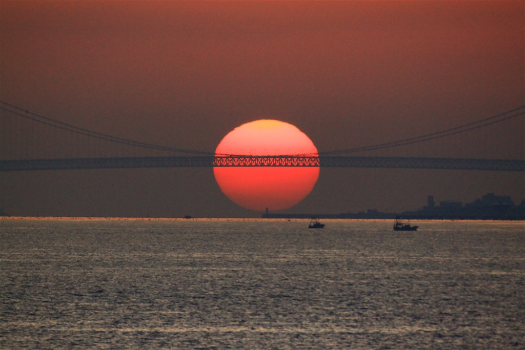 望遠:この日・場所・時間・天候でしか撮れない明石海峡大橋の中央に沈む夕日です