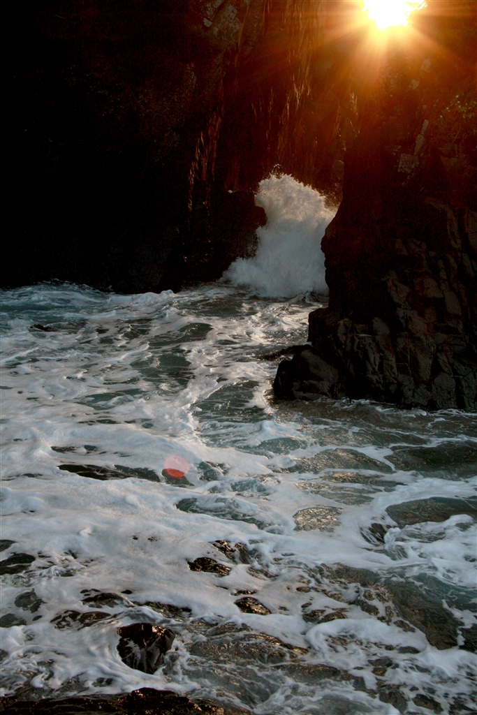 「神割崎の朝日U」・・・直ぐ後ろが崖にになって光が拡散!?