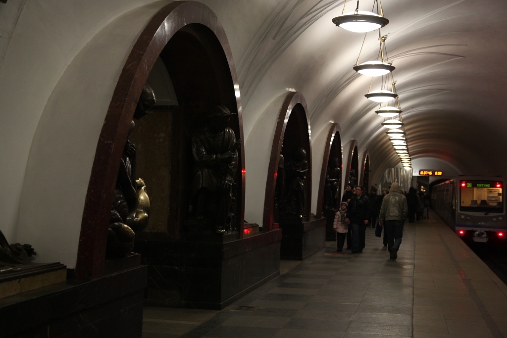 彫刻の並ぶ駅