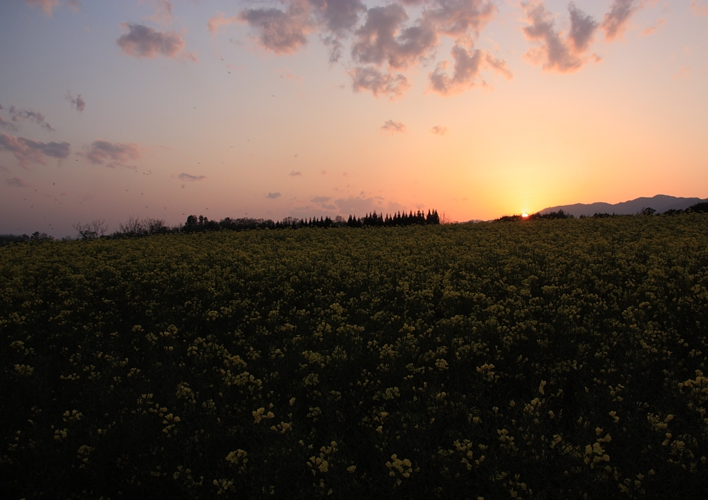 沈み行く夕日と菜の花畑