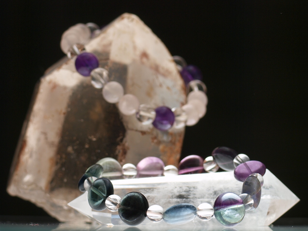 手前のブレスレットは蛍石