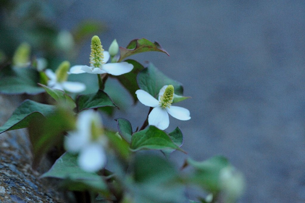 狭い路地の傍らに咲く花も