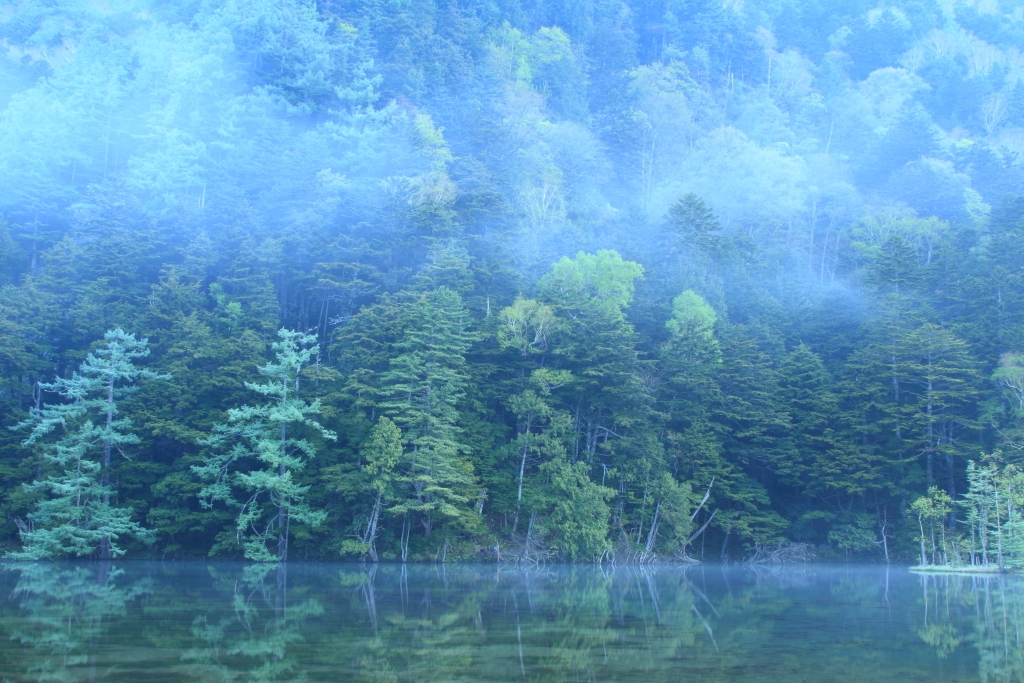 朝霧煙る明神池