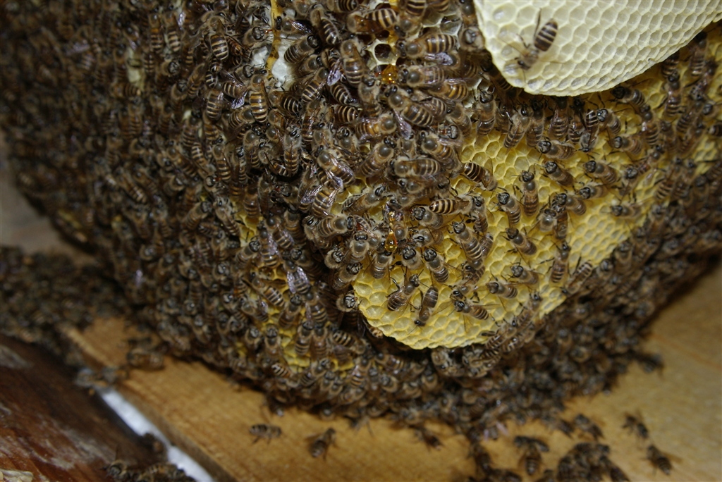 日本ミツバチ リンゴ箱に作られた自然巣