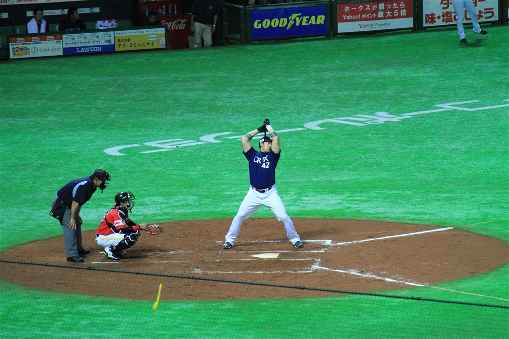 背中にバットが当たるまで反り返るカブレラ選手