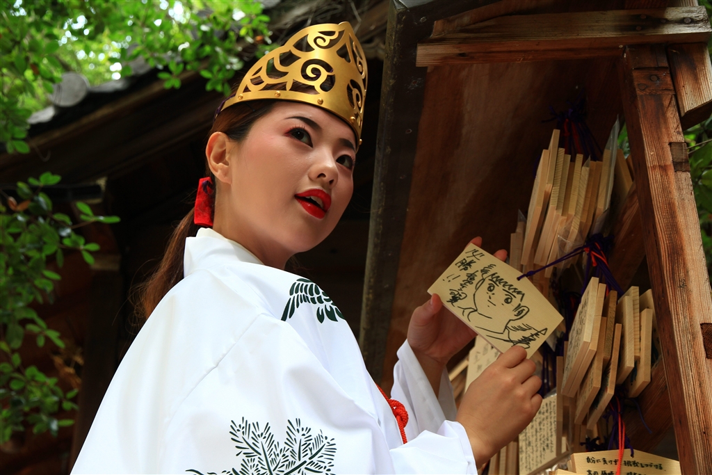 巫女さん(モデル)の笑顔のポーズ