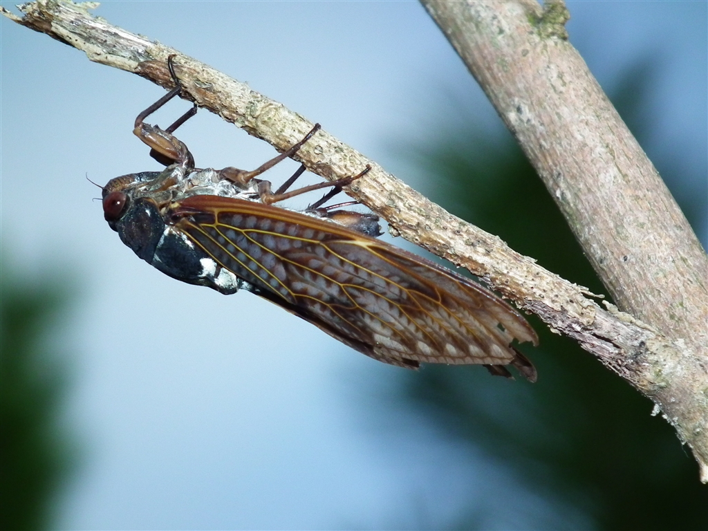 産卵管を枯れ木に差込みタマゴを産み付けています