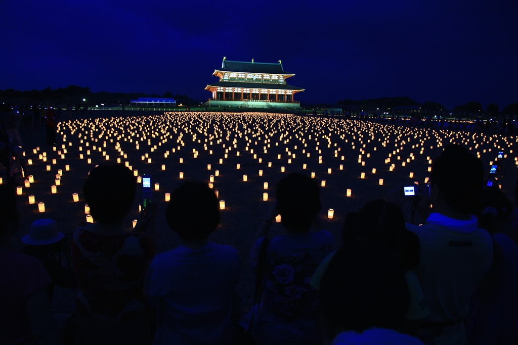 夕闇の中の第一次大極殿院と燈花