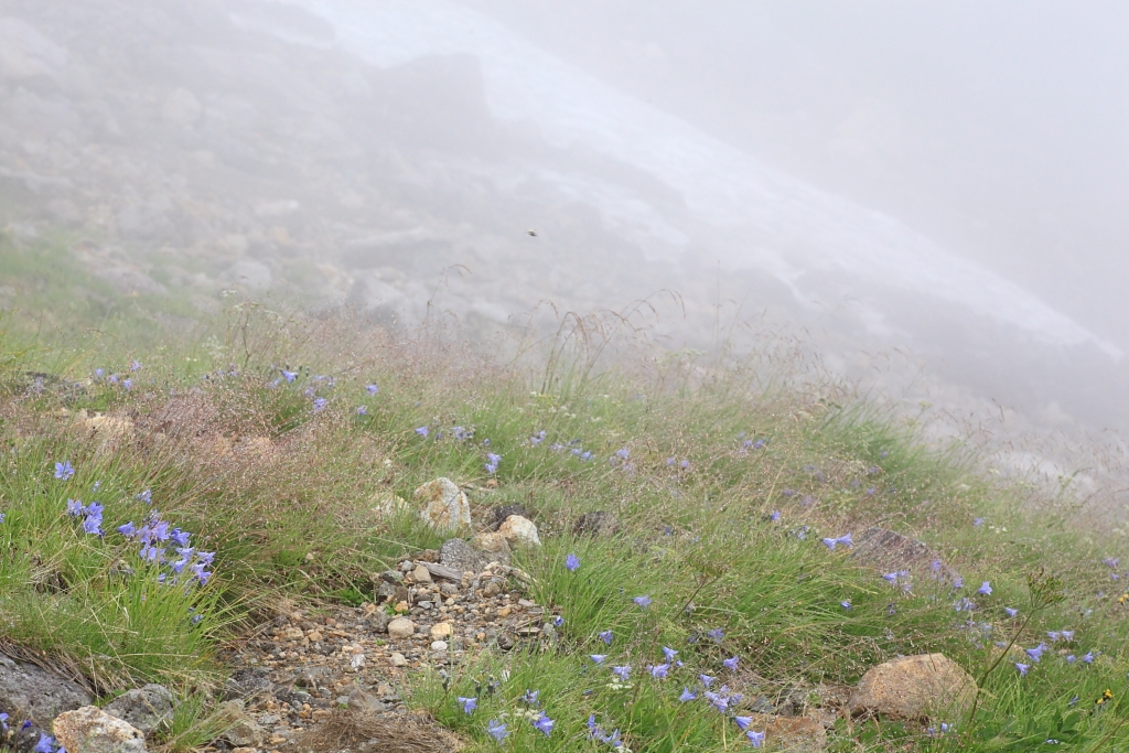 霧と雪渓とチシマギキョウ