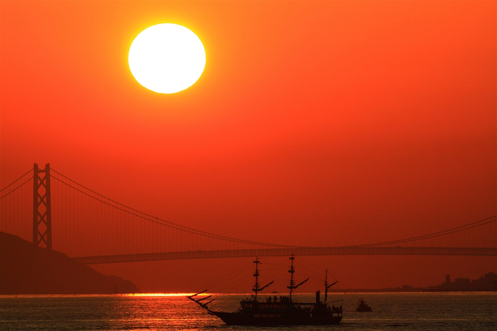 明石海峡大橋の向こうに見た真っ赤な夕空