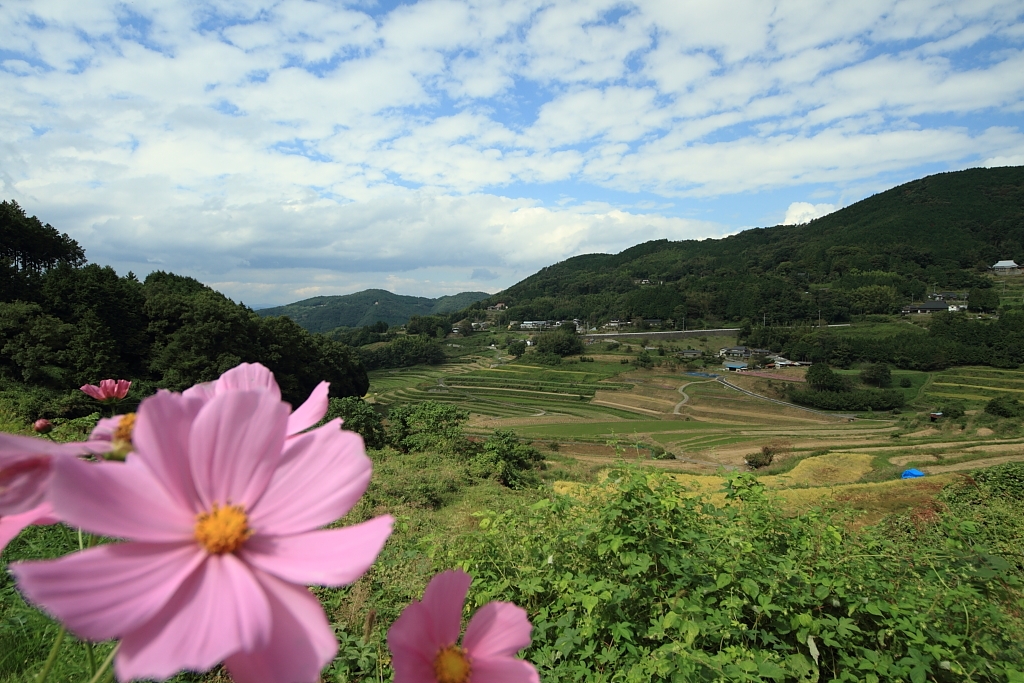 棚田とコスモス