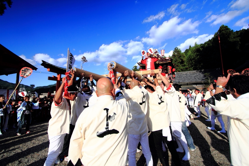 男達が太鼓台を天まで届けと差し上げます