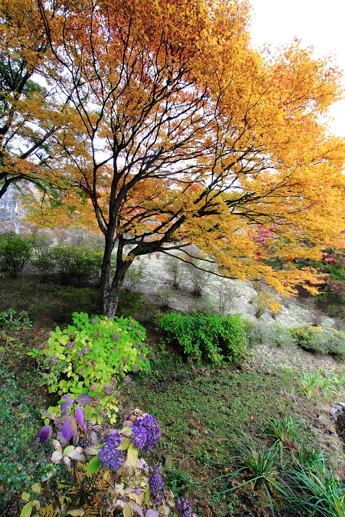 黄葉とアジサイ ←