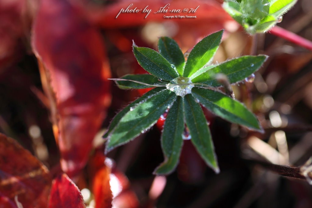 紅葉に囲まれた朝露を抱く青葉