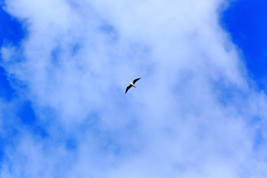 大空を一羽行くユリカモメ ←