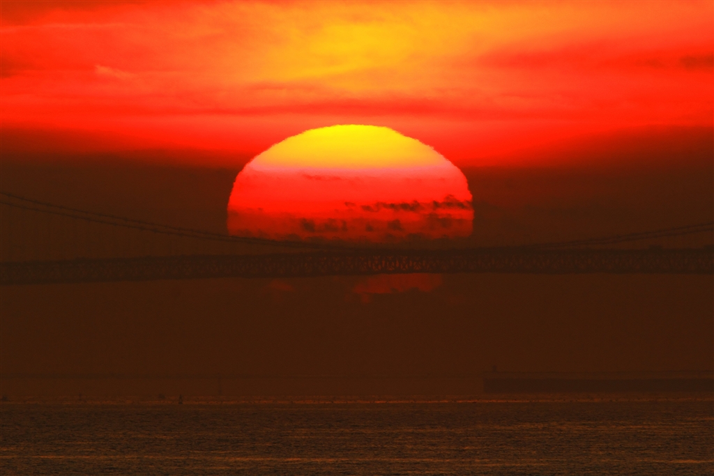 夕陽が橋にかかる頃にグチャグチャの形に(水平線上に横一線の橋みたいな蜃気楼が…)
