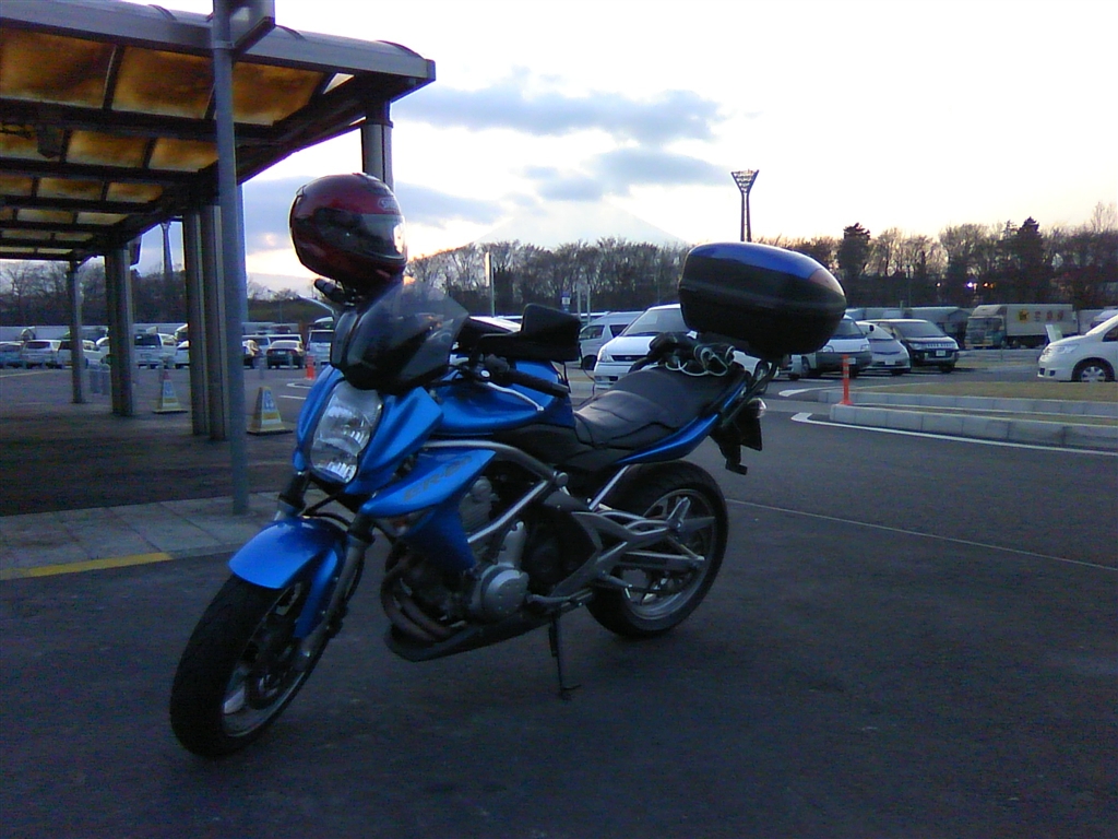 夕暮れの足柄SA。バイクの向こうに富士の影。