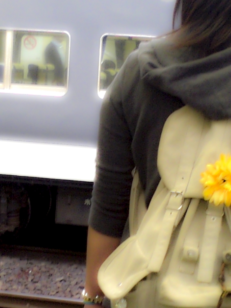 ホームのおねぇさん、視線の向こうに車内の男性の影!(リュックの黄花を前景にして