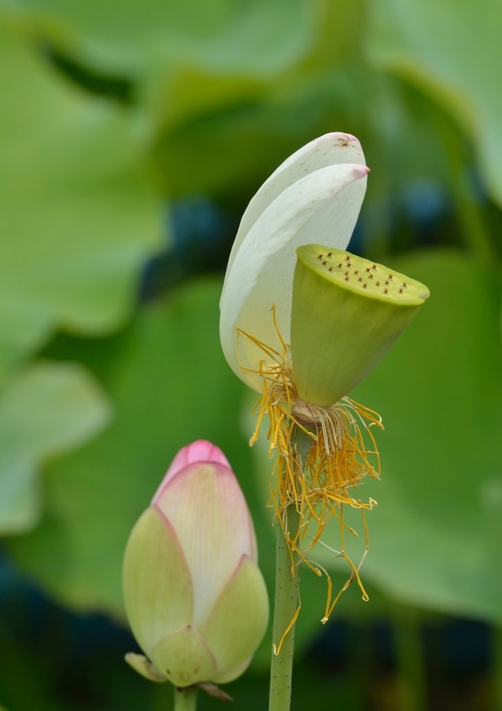 B花弁が落ちかけたハスとつぼみ
