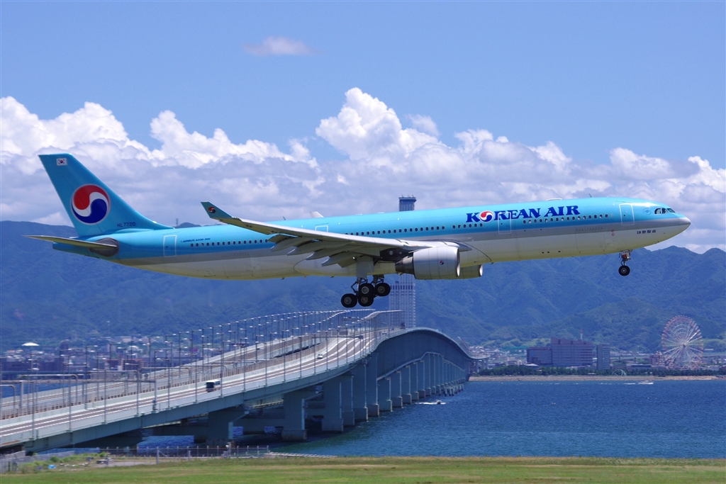 夏のトップライトを浴びて降りてくるコリアンエアーA330、美しいです・・・